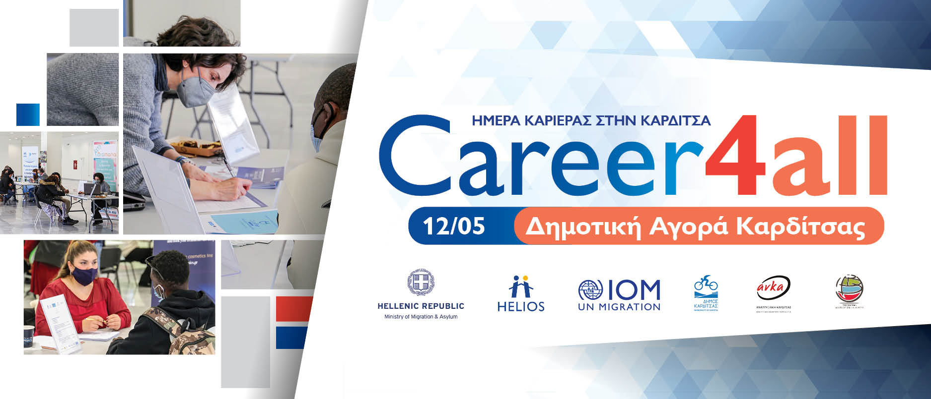 Tην Πέμπτη, 12 Μαΐου 2022, από τις 10:00 έως τις 16:00, πραγματοποιείται στην Καρδίτσα ημέρα καριέρας “Career4all”, με πρωτοβουλία του προγράμματος «HELIOS» του Διεθνούς Οργανισμού Μετανάστευσης σε συνεργασία με την Αναπτυξιακή Καρδίτσας Αναπτυξιακή Ανώνυμη Εταιρία Ο.Τ.Α (“ΑΝ.ΚΑ. Α.Ε.”) και με τη στήριξη του Δήμου Καρδίτσας.