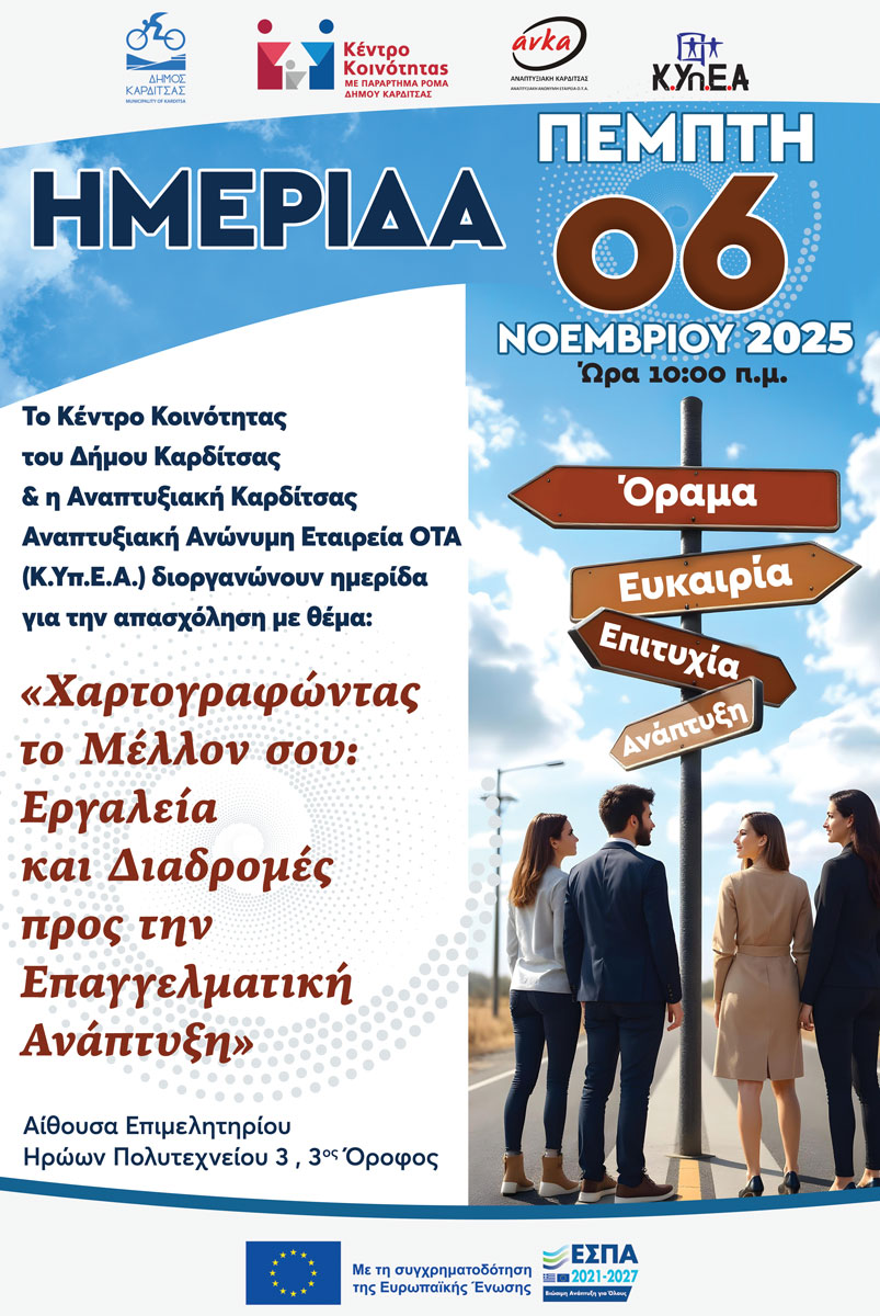 Πέμπτη 6 Νοεμβρίου 2025 & Ώρα 10:00 π.μ. |Αίθουσα Επιμελητηρίου (Ηρώων Πολυτεχνείου 3, 3ος όροφος) Θέλεις να σχεδιάσεις το επαγγελματικό σου μέλλον, να ανακαλύψεις νέες ευκαιρίες και να κάνεις το όραμά σου πραγματικότητα! Το Κέντρο Υποστήριξης Επιχειρηματικότητας Ανέργων (ΚΥπΕΑ) της Αναπτυξιακής Καρδίτσας Αναπτυξιακή Ανώνυμη Εταιρεία ΟΤΑ και το Κέντρο Κοινότητας του Δήμου Καρδίτσας σας προσκαλούν σε μια ενδιαφέρουσα ημερίδα με θέμα: «Χαρτογραφώντας το Μέλλον σου: Εργαλεία και Διαδρομές προς την Επαγγελματική Ανάπτυξη»