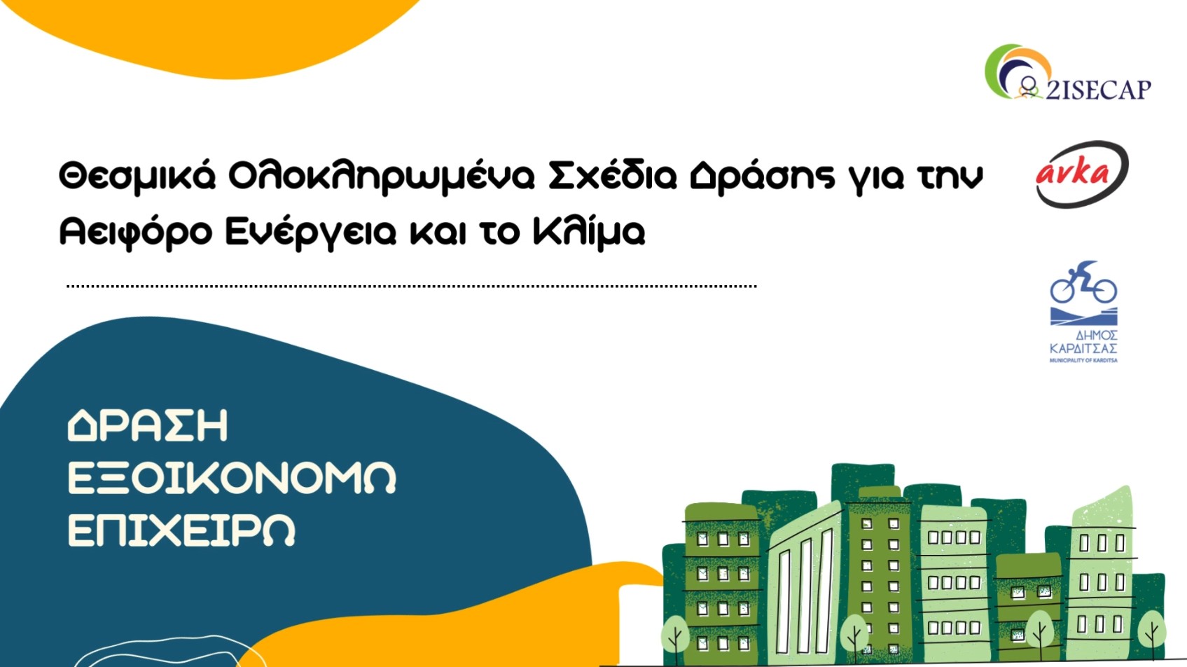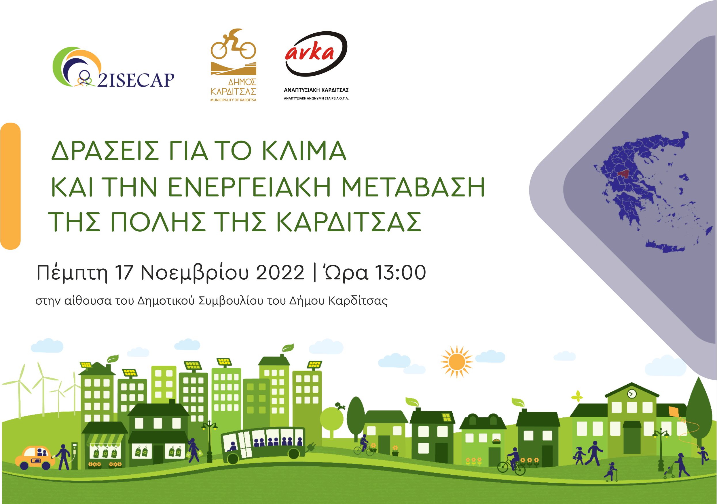 Mε την υποστήριξη της ΑΝ.ΚΑ. Α.Ε., στα πλαίσια το έργου 2ISECAP: «ΘΕΣΜΙΚΑ ΟΛΟΚΛΗΡΩΜΕΝΑ ΣΧΕΔΙΑ ΔΡΑΣΗΣ ΓΙΑ ΤΗΝ ΑΕΙΦΟΡΟ ΕΝΕΡΓΕΙΑ ΚΑΙ ΤΟ ΚΛΙΜΑ» ο Δήμος Καρδίτσας προχωρά σε δράσεις ευαισθητοποίησης για την ενημέρωση των πολιτών σε θέματα εξοικονόμησης ενέργειας σε συνεργασία με άλλους φορείς.