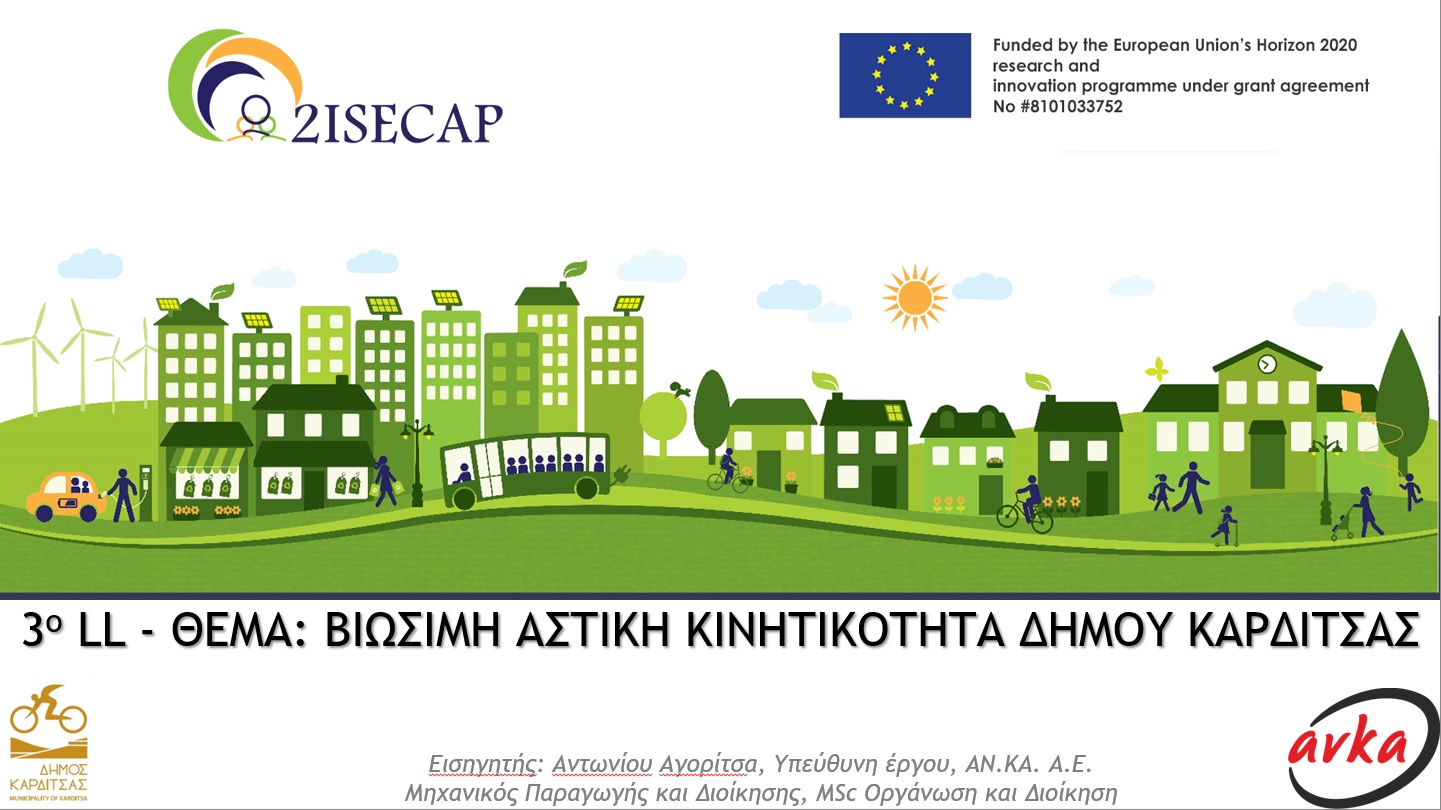 Την Παρασκευή 28/04/2023 διοργανώθηκε το 3ο «Ζωντανό Εργαστήριο» με πρωτοβουλία του Δήμου Καρδίτσας και την υποστήριξη της ομάδας έργου της ΑΝ.ΚΑ Α.Ε., μέσω της ψηφιακής πλατφόρμας ZOOM, στα πλαίσια του Ευρωπαϊκού Έργου 2ISECAP με θέμα τη «Βιώσιμη Αστική Κινητικότητα».