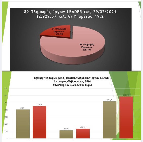 Το δίμηνο Ιανουάριος - Φεβρουάριος η εταιρεία μας ολοκλήρωσε επιτυχώς 10 πληρωμές σε δημόσια και ιδιωτικά έργα LEADER συνολικού ύψους 336,3 χιλ. ευρώ.