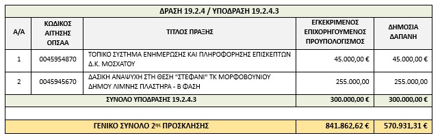 Επίσης, εκδόθηκε η υπ’ αριθ. 102/12-01-2024 απόφαση του Περιφερειάρχη Θεσσαλίας με την οποία εντάχθηκαν έργα δημόσιου χαρακτήρα προϋπολογισμού 300.000,00 € στην Υποδράση 19.2.4.3. «Στήριξη για επενδύσεις για δημόσια χρήση σε υπηρεσίες και υποδομές αναψυχής, ανάπλασης χώρων εντός οικισμών, τουριστικές πληροφορίες και τουριστικές υποδομές μικρής κλίμακας (ενδεικτικά: σημάνσεις, δημόσιοι κοινόχρηστοι χώροι, προβολή προώθηση περιοχών, ποδηλατικές διαδρομές)».