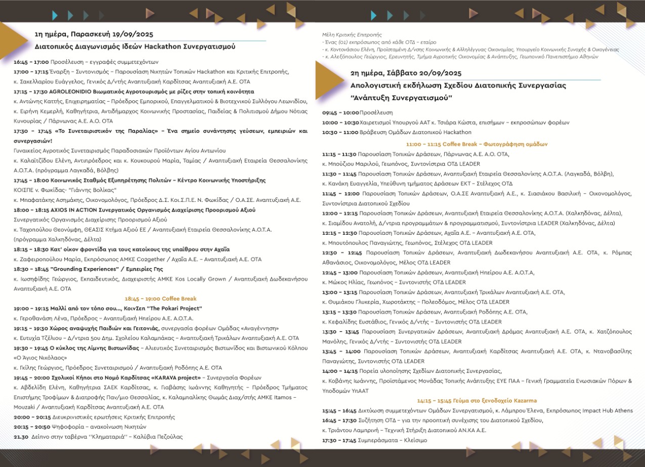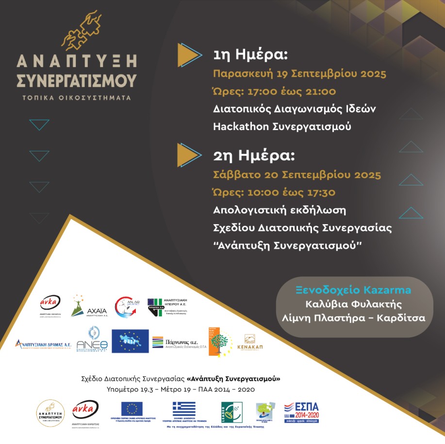 Παρασκευή 19 Σεπτεμβρίου 2025 και ώρα 17.00, το Διατοπικό Διαγωνισμό Ιδεών – Hackathon Συνεργατισμού στην περιοχή της Λίμνης Πλαστήρα. Στο Hackathon θα διαγωνιστούν οι εκπρόσωποι 10 αγροτικών περιοχών της χώρας ως οι νικήτριες ομάδες – ιδέες των τοπικών Hackathon Συνεργατισμού που έλαβαν χώρα κατά τη διάρκεια του καλοκαιριού.