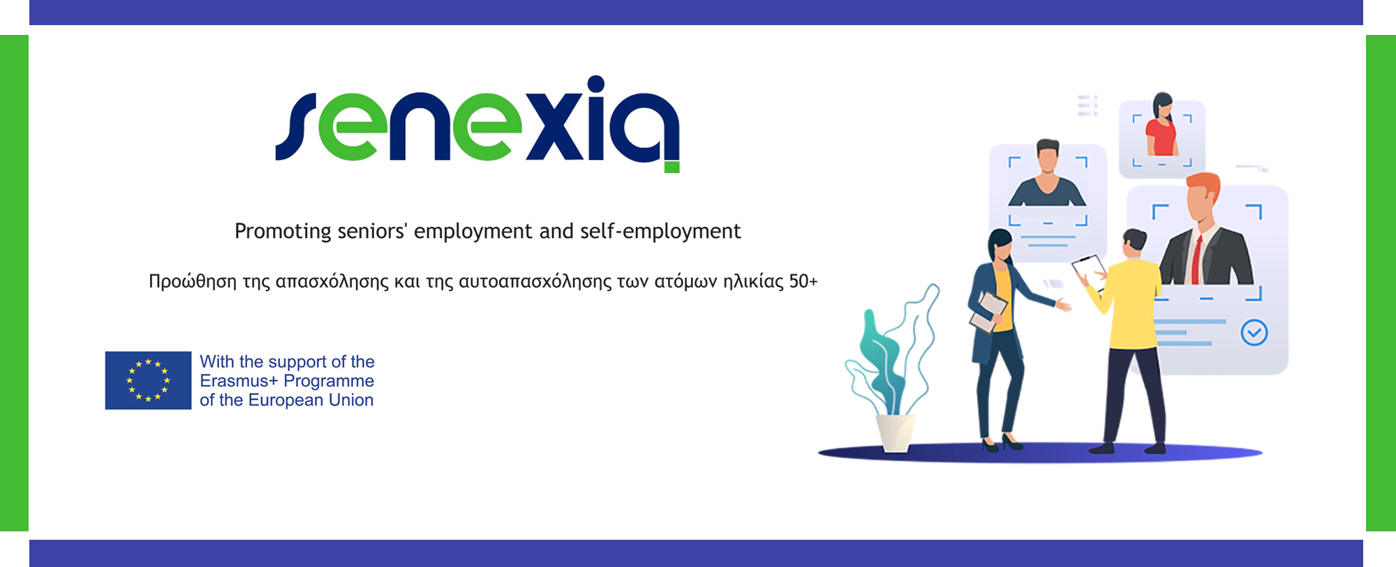 Το ευρωπαϊκό έργο Erasmus+ με τίτλο SENEXIA - Προώθηση της απασχόλησης και της αυτοαπασχόλησης των ηλικιωμένων και αριθμό σύμβασης: 2021-1-FR01-KA220-ADU-000027099 υλοποιείται από σύμπραξη, με συντονιστή την οργάνωση Générations Solidaires Val d'Oise 95 - Γαλλία και εταίρους τους The Rural Hub CLG - Ιρλανδία, Anmiro Oy - Φινλανδία, INTEGRA FILDER E. V. - Γερμανία, DRUZHESTVO ZNANIE - Βουλγαρία και την AN. ΚΑ. S.A. - Ελλάδα.