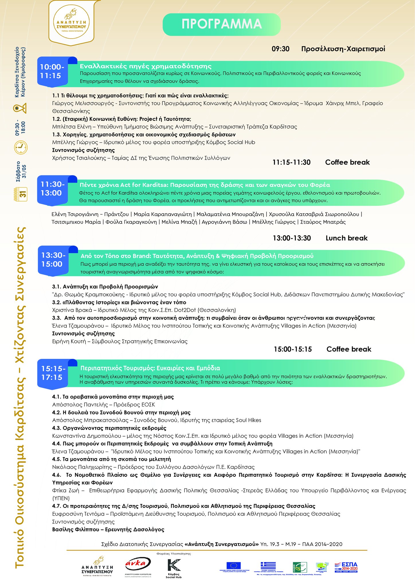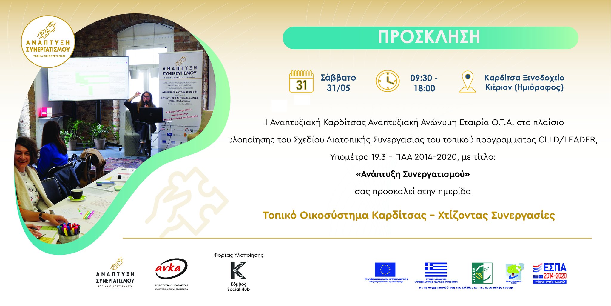 Η εκδήλωση εντάσσεται στο Σχέδιο Διατοπικής Συνεργασίας «Ανάπτυξη Συνεργατισμού» » του προγράμματος CLLD/LEADER, Υπομέτρο 19.3 του ΠΑΑ 2014-2020.