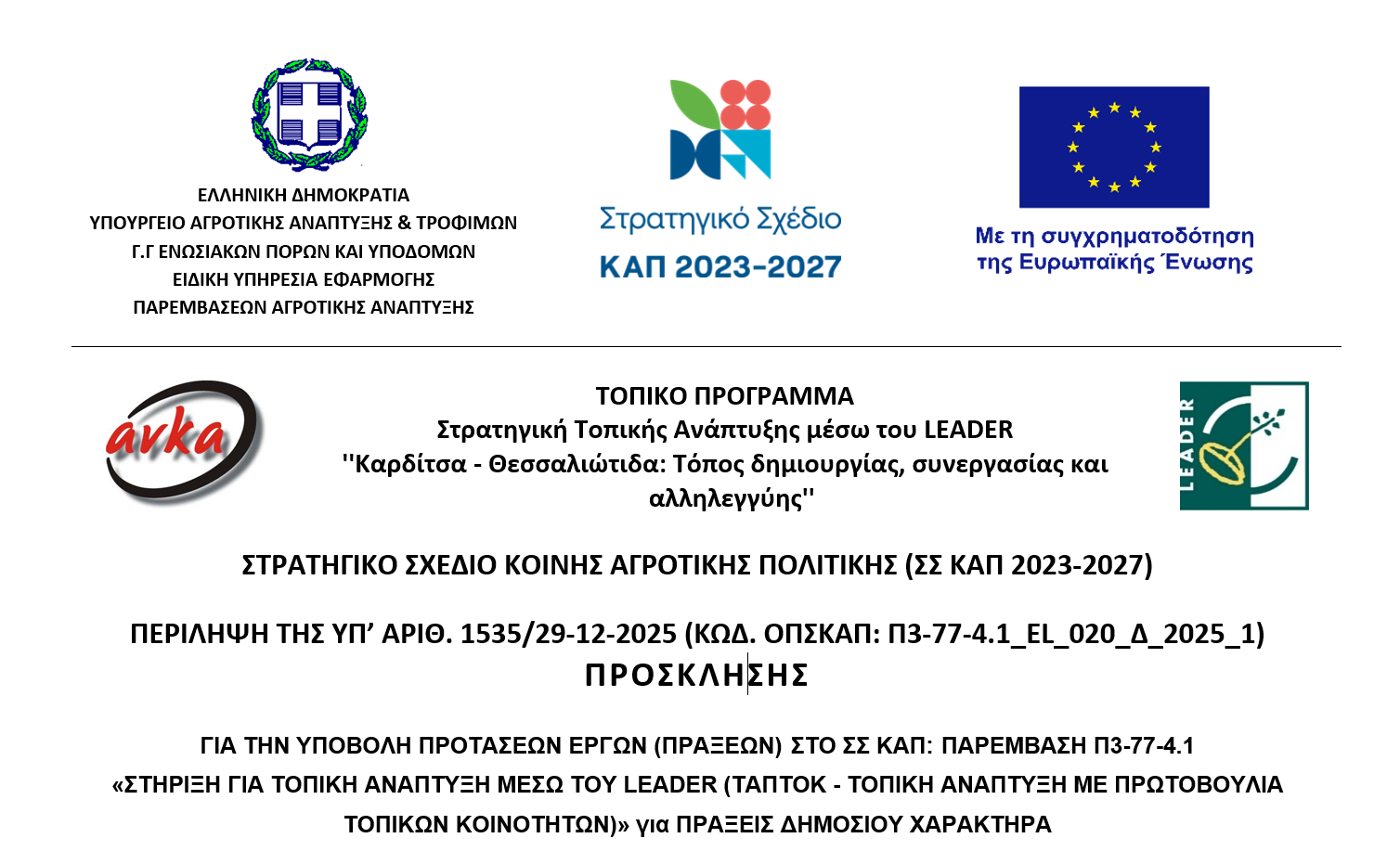 1. Το Τοπικό Πρόγραμμα «Στρατηγική Τοπικής Ανάπτυξης μέσω του LEADER ''Καρδίτσα - Θεσσαλιώτιδα: Τόπος δημιουργίας, συνεργασίας και αλληλεγγύης”» το οποίο εγκρίθηκε, με την αριθ. 2097/10-11-2023 (ΦΕΚ 6539/Β) Απόφαση του Υπουργού Αγροτικής Ανάπτυξης και Τροφίμων.