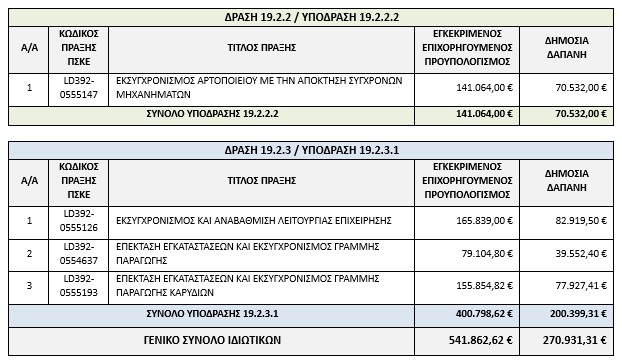 Οι 4 επενδυτικές προτάσεις συνολικού προϋπολογισμού 541.862,62 € αφορούν την μεταποίηση, εμπορία και/ή ανάπτυξη γεωργικού προϊόντος με αποτέλεσμα γεωργικό προϊόν ή και μη γεωργικό προϊόν στους τομείς του οίνου, των αρτοσκευασμάτων, των αμυγδάλων και καρυδιών.