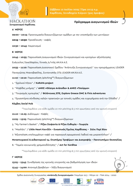 🔸Ο νικητής θα συμμετάσχει στο Διατοπικό Hackathon Συνεργατισμού μεταξύ 12 περιοχών της Ελλάδος που θα οργανωθεί το Σεπτέμβριο στην Καρδίτσα.