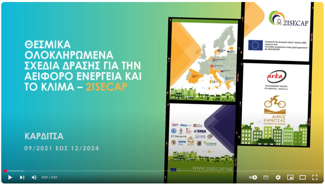 Το διακρατικό έργο 2ISECAP σ' ένα 5 min video, όπου παρουσιάζονται οι δράσεις εφαρμογής μιας συμμετοχικής προσέγγισης σχεδιασμού για την αειφόρο ενέργεια και το κλίμα στο Δήμο Καρδίτσας.